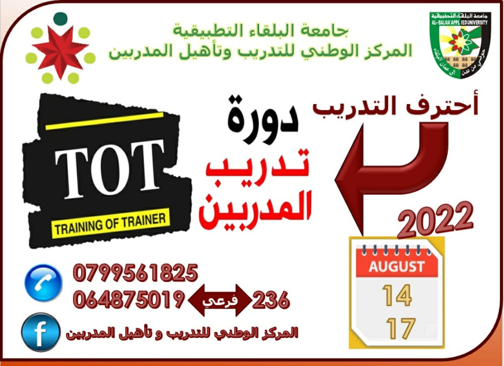 يعلن المركز الوطني للتدريب وتأهيل المدربين / جامعة البلقاء التطبيقية عن عقد دورة تدريب المدربين TOT