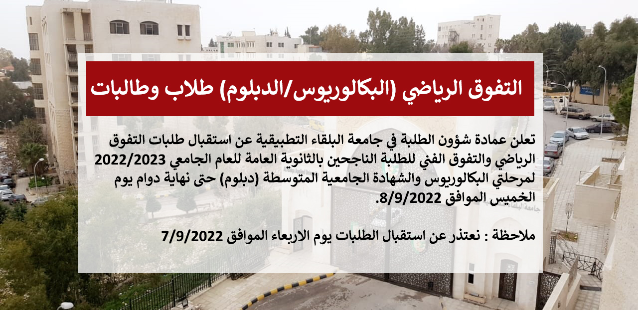 تعلن عمادة شؤون الطلبة في جامعة البلقاء التطبيقية عن استقبال طلبات التفوق الرياضي والتفوق الفني للطلبة الناجحين بالثانوية العامة للعام الجامعي 2022/2023 لمرحلتي البكالوريوس والشهادة الجامعية المتوسطة (دبلوم) حتى نهاية دوام يوم الخميس الموافق 8/9/2022.