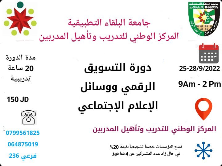 يعلن المركز الوطني للتدريب وتأهيل المدربين / جامعة البلقاء التطبيقية عن عقد دورة التسويق الرقمي ووسائل الإعلام الإجتماعي