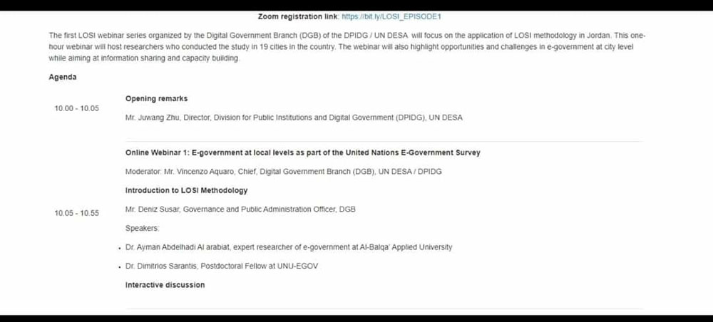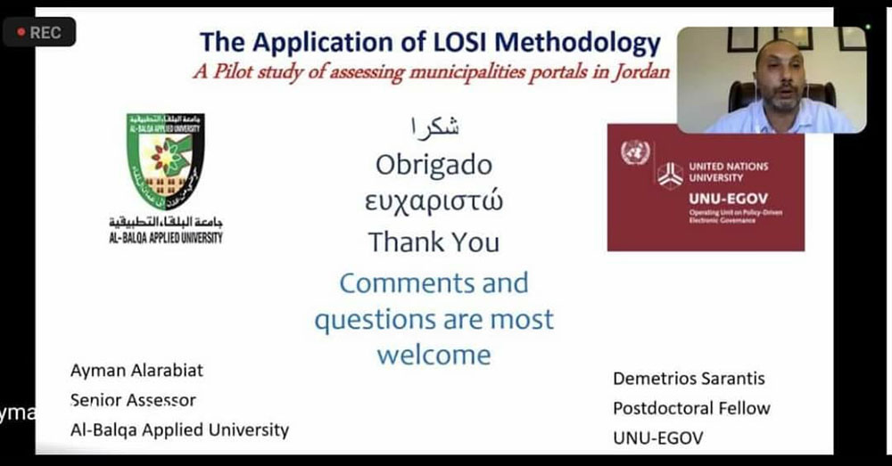 ، بالتعاون مع وحدة الحوكمة الإلكترونية المستندة إلى السياسات / جامعة الأمم المتحدة (UNU-EGOV) و شعبة المؤسسات العامة والحكومة الرقمية (DPIDG) التابعة لإدارة الأمم المتحدة للشؤون الاقتصادية والاجتماعية (UNDESA) التي تركز على تطبيق منهجية LOSI في الأردن.