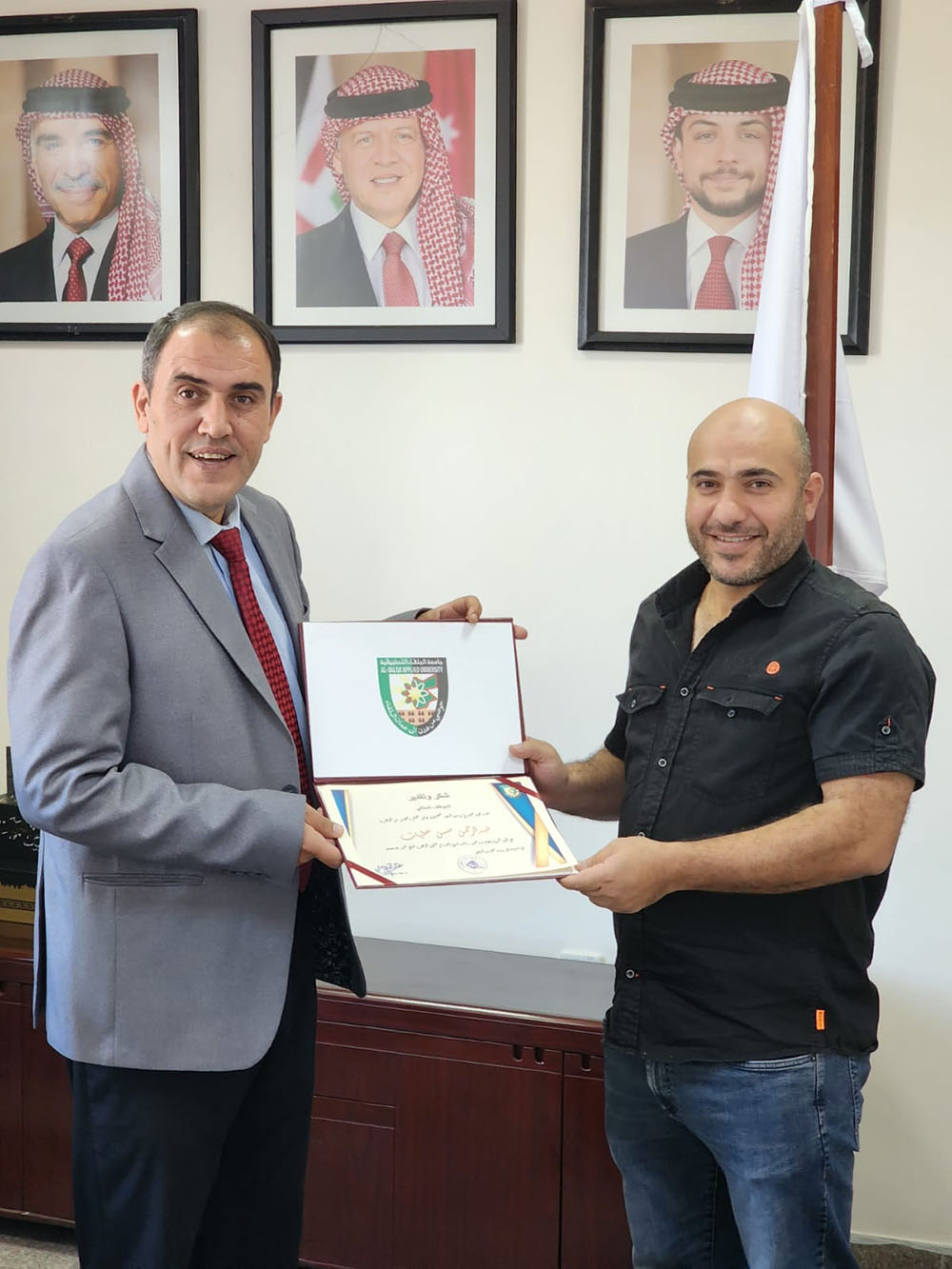 انسجامًا مع توجهات إدارة الجامعة في تحسين الأداء والتطوير وتحفيز قيم التنافس البناء في العمل لدى الموظفين كرم عميد كلية العلوم الاستاذ الدكتور احمد سامي البطاينة شهادة الموظف المثالي (شهادة تقديرية) عن شهر حزيران/2022 للموظف عبدالرحمن حسن عطيات