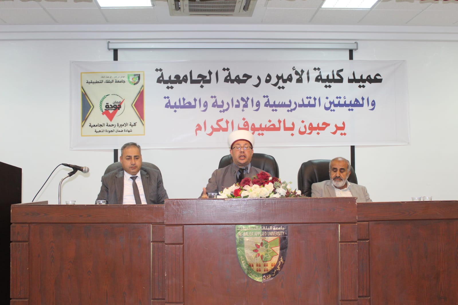تحت رعاية عميد كلية الأميرة رحمة الجامعية الدكتور مزيد حياصات أقام قسم النشاطات الطلابية وبالتعاون مع شعبة المجتمع المحلي وإشراف مساعد العميد للشؤون الطلابية الدكتورة خيرية شنيكات محاضرة دينية بمناسبة ذكرى المولد النبوي الشريف القاها فضيلة مفتي محافظة البلقاء الدكتور هاني العابد .