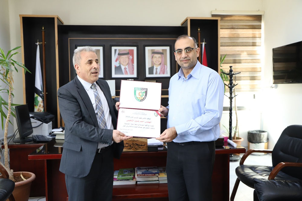 انسجامًا مع توجهات جامعة البلقاء التطبيقية في تحسين الأداء والتطوير وتحفيز قيم التنافس البنّاء في العمل لدى الموظفين قام عميد كلية الهندسة الأستاذ الدكتور سميح الرواشدة بتسليم شهادة الموظف المثالي عن شهر تشرين الاول / 2022 للموظف المهندس احمد ياسين الشخيبي وذلك تقديرا لجهوده المتميزة وعطاءه في خدمة الكلية، مقدما شكره لكافة العاملين في الكلية داعيا الجميع الى العمل بروح الفريق الواحد وتحقيق الانجاز وتعزيز قيم الانتماء الوظيفي للجامعة.