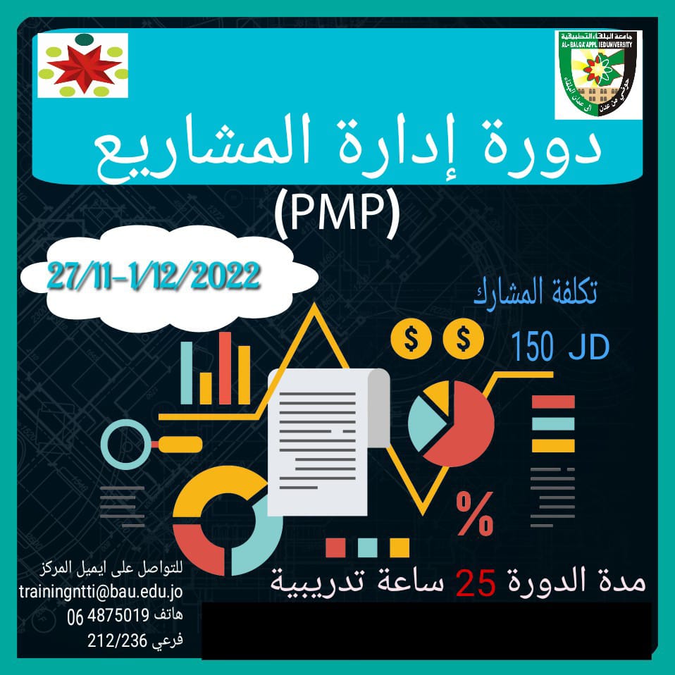 يعلن المركز الوطني للتدريب وتأهيل المدربين / جامعة البلقاء التطبيقية عن عقد دورة إدارة المشاريع pmp وذلك يوم الأحد الموافق 27/11 -1/12/2022