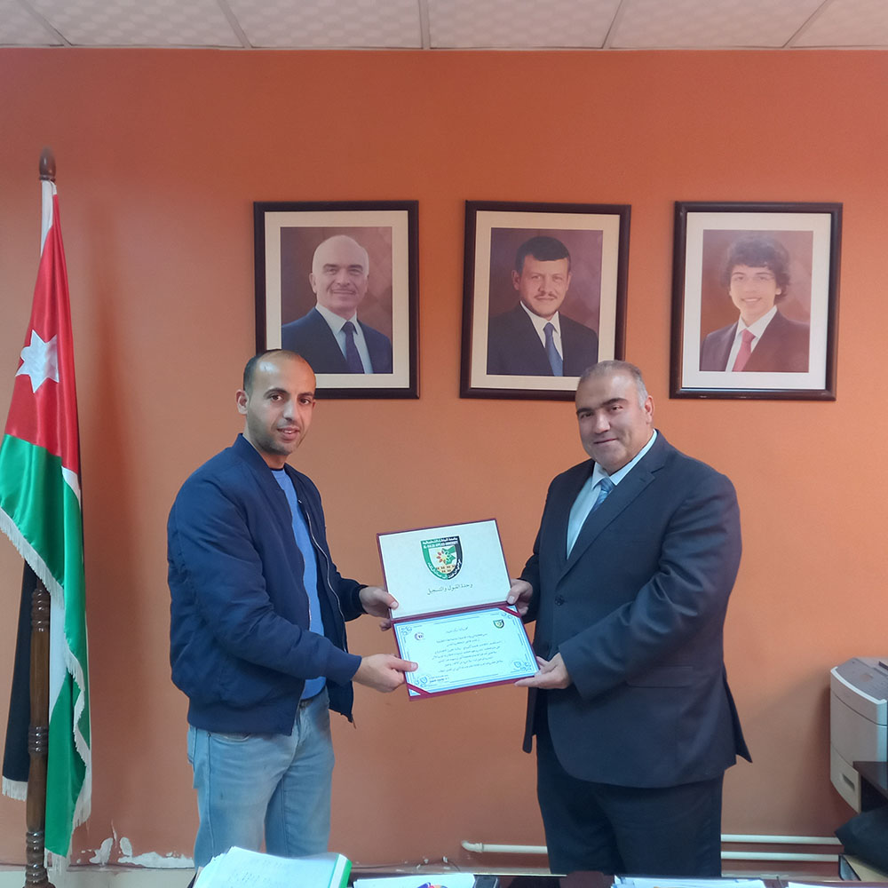 سلم الأستاذ الدكتور محمد غيث عميد كلية الزرقاء الجامعية شهادة تقدير الموظف المثالي للموظف مهند عبدالكريم شاكر من قسم المحاسبة عن شهر تشرين الثاني للعام الجامعي 2022/2023