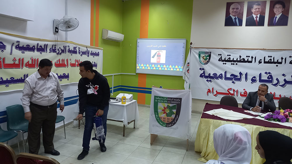 رعى الأستاذ الدكتور بسام العسود نائب عميد الكلية افتتاح الورشة التوعوية بعنوان (السلامة والصحة المهنية) حيث نفذت الورشة بالتعاون مع معهد السلامة والصحة المهنية/ماركا ممثلا بمدير المعهد الدكتور المهندس علي الحياري وهيئة شباب كلنا الأردن/الزرقاء ممثلة بالمنسق الأستاذ سمير الفاخوري وبحضور عدد من أعضاء الهيئتين التدريسية والإدارية والطلبة وعدد من أبناء المجتمع المحلي.