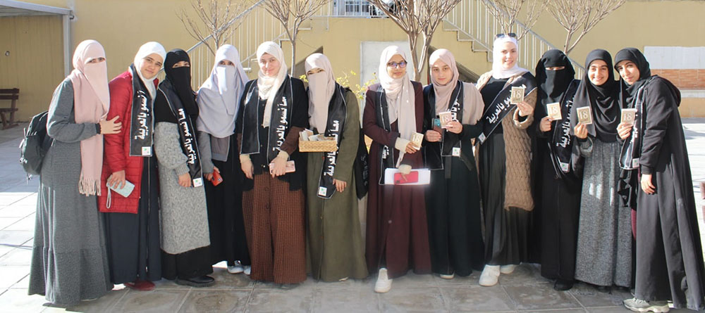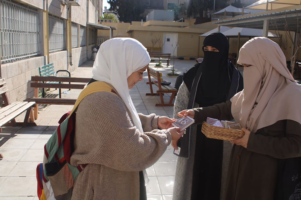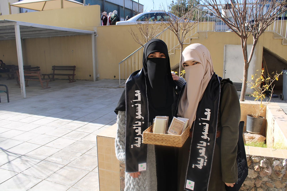 و تم توزيع كتيبات على طالبات الكلية موثقة بتاريخ اليوم العالمي للغة العربية من قبل المبادرة الطلابية غراس تحت شعار(معاً نسمو بالعربية).