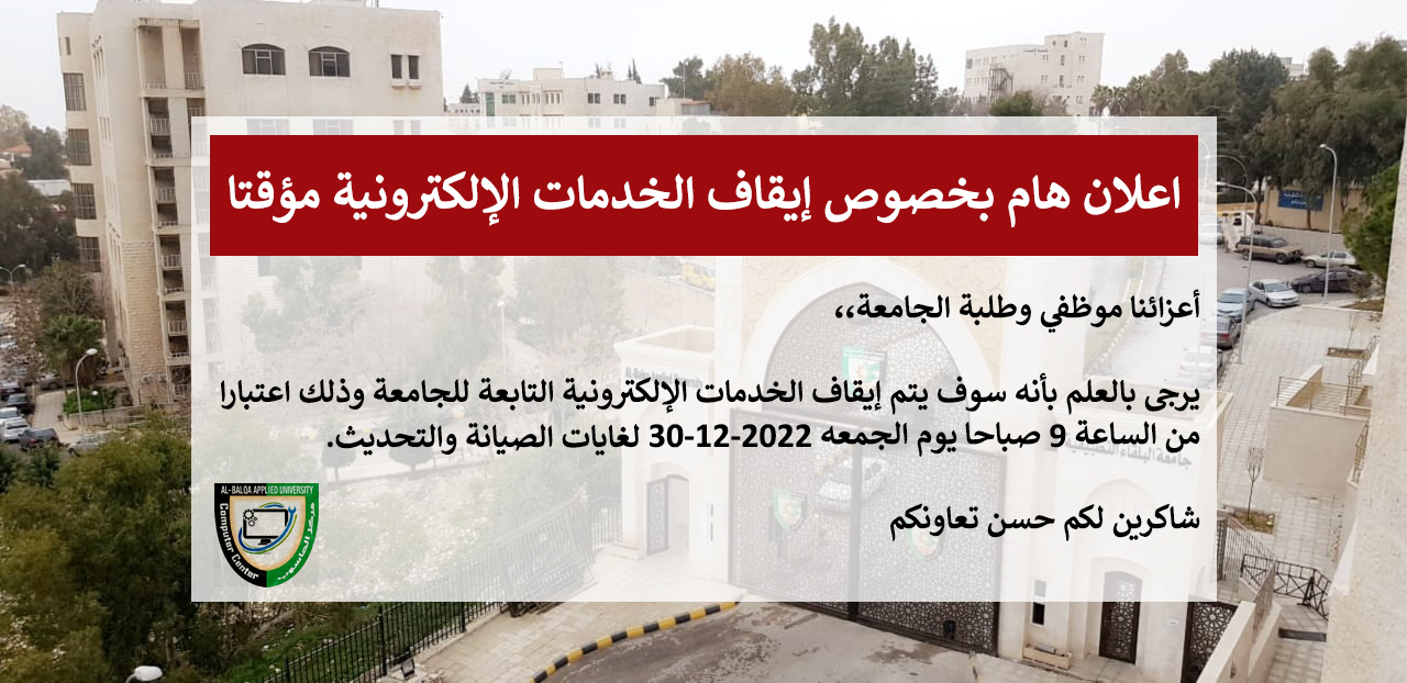 يرجى بالعلم بأنه سوف يتم إيقاف الخدمات الإلكترونية التابعة للجامعة وذلك يوم اعتبارا من الساعة 9 صباحا يوم الجمعة 2022-12-30 لغايات الصيانة والتحديث.