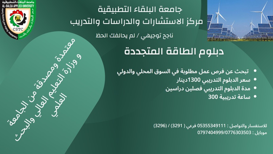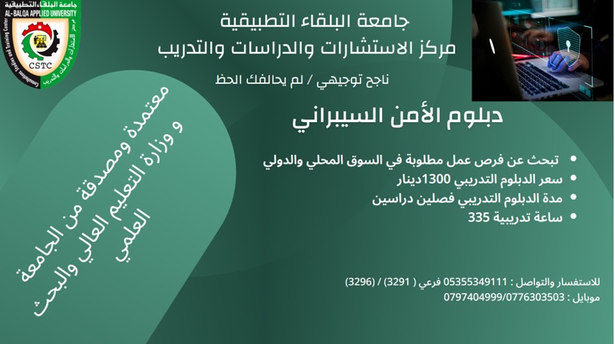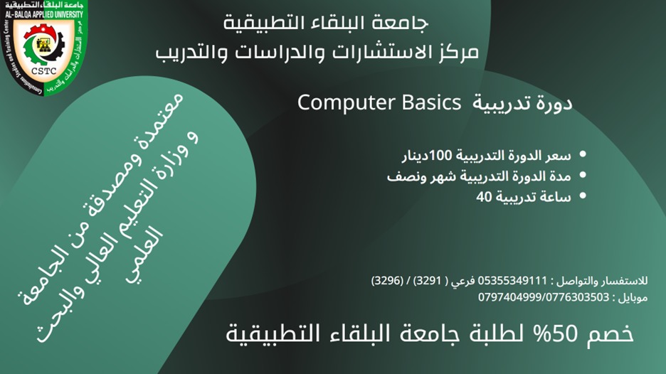 - شهادة تدريبية معتمدة ومصدقة من جامعة البلقاء التطبيقية و معتمدة من وزارة التعليم العالي و البحث العلمي