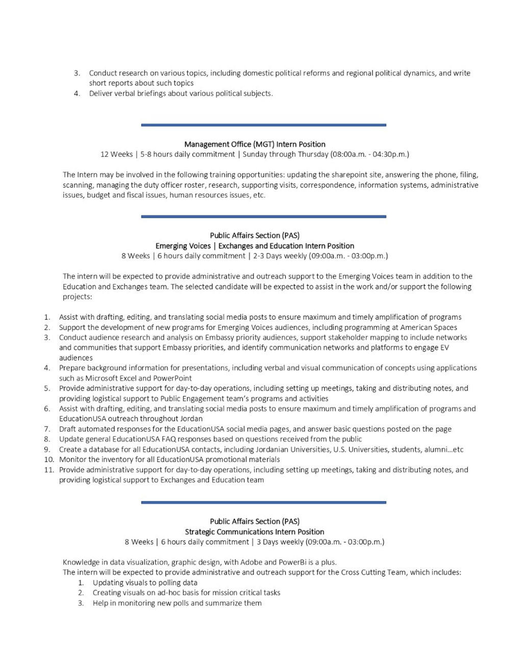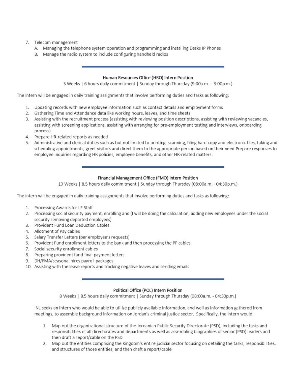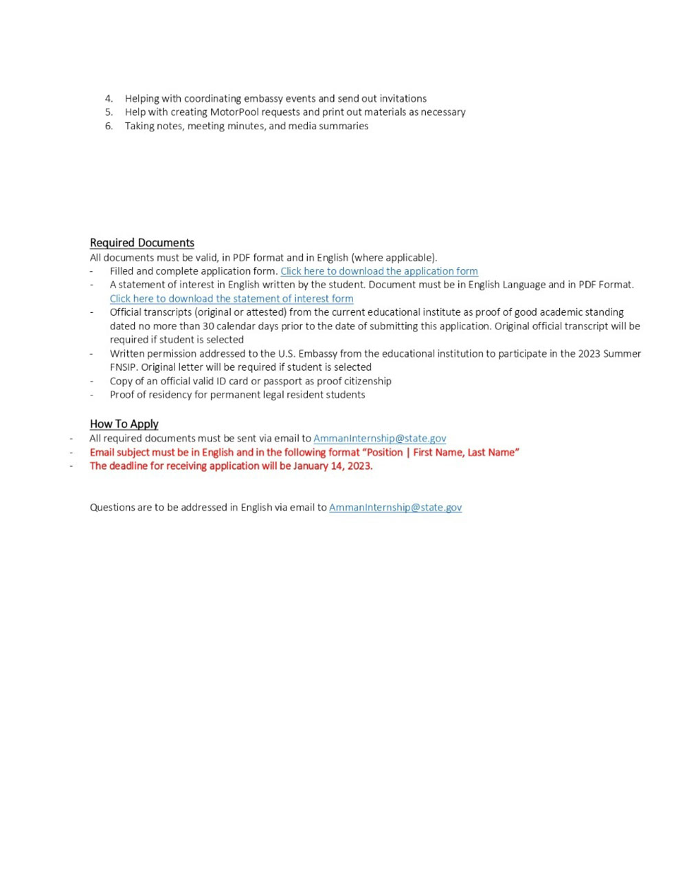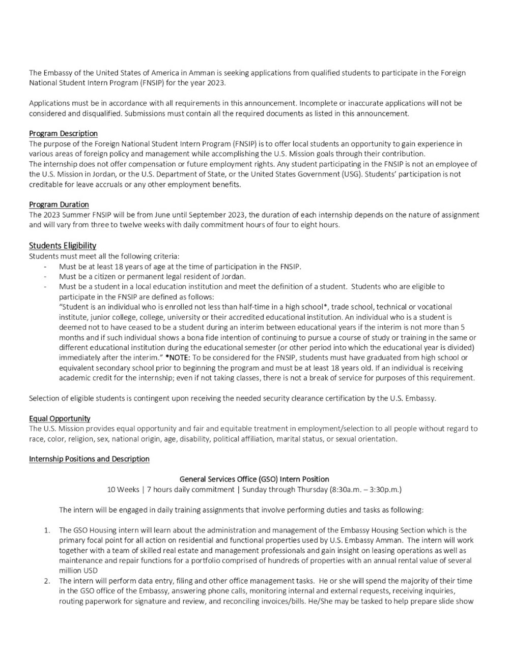 الغرض من FNSIP هو إتاحة الفرصة للطلاب المحليين لاكتساب الخبرة في مختلف مجالات السياسة الخارجية والإدارة. أي طالب مشارك في FNSIP ليس موظفًا في بعثة الولايات المتحدة في الأردن ، أو وزارة الخارجية الأمريكية ، أو حكومة الولايات المتحدة (USG). لا تُصدق مشاركة الطلاب على استحقاقات الإجازات أو أي مزايا وظيفية أخرى.