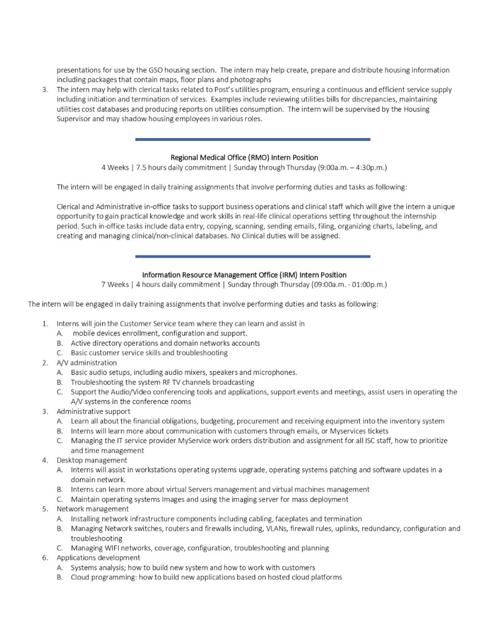 يجب أن تكون الطلبات متوافقة مع جميع المتطلبات الواردة في الإعلان المرفق الذي يحتوي على معلومات مفصلة حول أهلية الطلاب والمستندات المطلوبة وفرص التدريب المتاحة ووصفها وكيفية التقديم. لن يتم النظر في الطلبات غير المكتملة وسيتم استبعادها. يجب أن تحتوي الطلبات على جميع المستندات المطلوبة كما هو مذكور في الإعلان. الموعد النهائي لاستلام الطلب سيكون 14 يناير 2023.