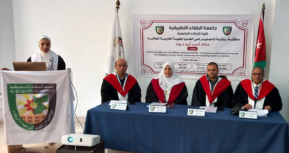 ضمن الإجراءات الأكاديمية المعتمدة في كلية الزرقاء الجامعية/ جامعة البلقاء التطبيقية للحصول على شهادة الماجستير تم يوم الأربعاء الموافق 28/12/2022 مناقشة رسالة ماجستير في تخصص التحاليل الطبية ، والتي تقدمت بها الطالبة: ملاك أحمد أبو عواد بعنوان: