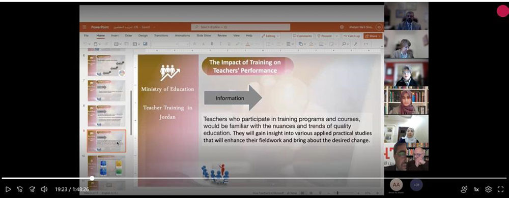 أشارت الدكتورة قبيلات خلال كلمتها إلى تجربة الاردن في تدريب المعلمين قبل وأثناء الخدمة والأثر الإيجابي للتدريب وآليات تنفيذ برامج تدريب المعلمين قبل الخدمة، بالإضافة الى الدبلوم المهني للإعداد تأهيل المعلمين الذي تقوم برعايته الوكالة الأمريكية للتنمية الدولية (USAID) بالشراكة مع وزارة التربية والتعليم ووزارة التعليم العالي والبحث العلمي وأكاديمية الملكة رانيا لتدريب المعلمين وديوان الخدمة المدنية وهيئة اعتماد مؤسسات التعليم العالي وضمان الجودة.
