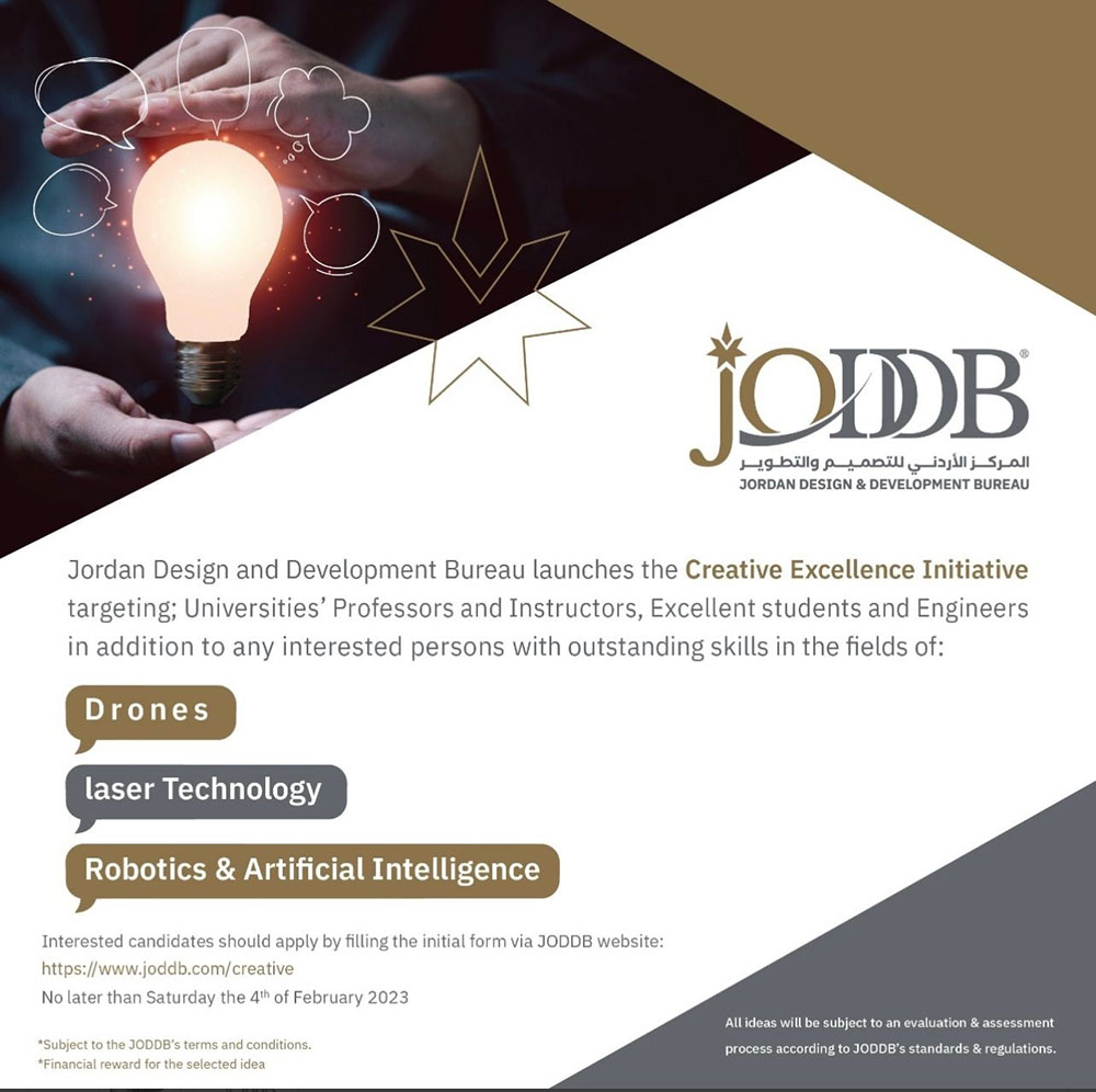 بالتنسيق مع مركز الابتكار و الابداع و ريادة الاعمال في عمادة البحث و الابتكار يعلن المركز الأردني للتصميم والتطوير (JODDB) إطلاق "مبادرة التميز الإبداعي" للمهندسين و الاساتذه والطلبه المتفوقين في جامعة البلقاء التطبيقيه وكل من يمتلكون المهارات والكفاءات المتميزة والمهتمين في مجالات "تكنولوجيا الليزر، والروبوت، والذكاء الاصطناعي، والطائرات المسيرة".