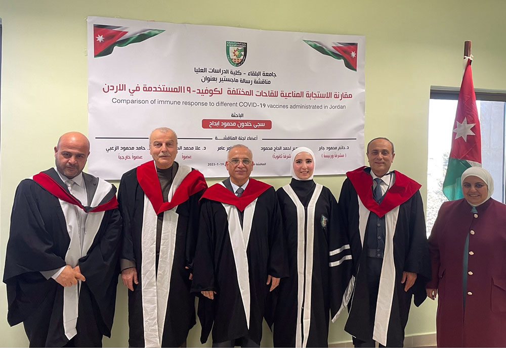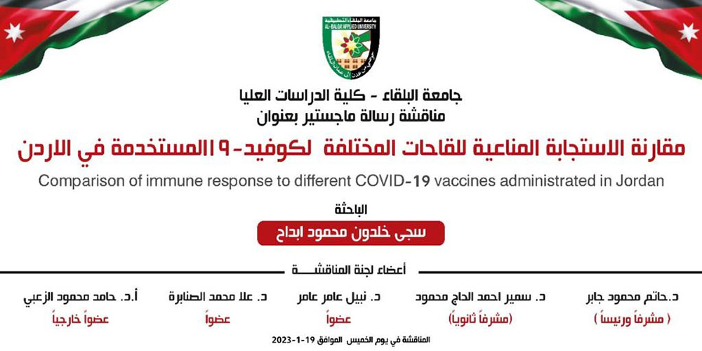 ضمن الاجراءات الاكاديمية المعتمدة في كلية العلوم جامعة البلقاء التطبيقية/ المركز للحصول على شهادة الماجستير تم يوم الخميس الموافق 19/1/2023. مناقشة رسالة الماجستير في تخصص الرياضيات والتي تقدمت بها الطالبة " سجى خلدون ابداح " بعنوان: