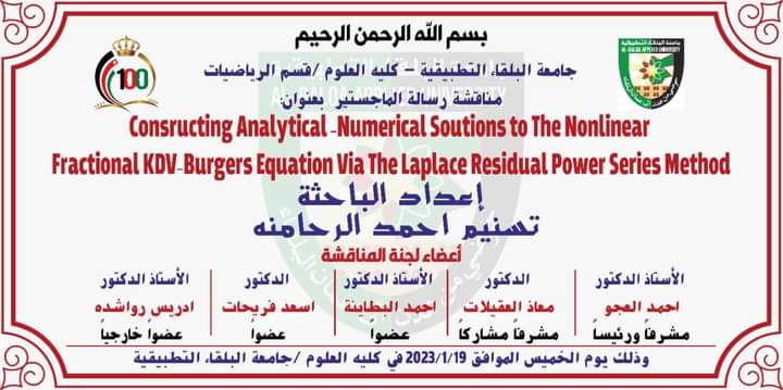 ضمن الاجراءات الاكاديمية المعتمدة في كلية العلوم جامعة البلقاء التطبيقية/ المركز  للحصول على شهادة الماجستير تم يوم الخميس الموافق 19/1/2023. مناقشة رسالة الماجستير في تخصص الرياضيات والتي تقدمت بها الطالبة " تسنيم احمد الرحامنه " بعنوان: