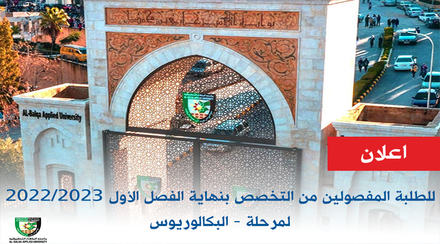 يعلن المسجل العام في الجامعة للطلبة المفصولين من تخصصاتهم لمرحلة البكالوريوس بنهاية الفصل الدراسي الأول 2022/2023 بأنه بإمكانهم تقديم طلب انتقال إلى تخصص أخر معدل قبوله (معدل الثانوية) أدنى من التخصص الذي قبل فيه وضمن التخصصات المتاحة على الفصل الثاني 2022/2023 من خلال تقديم طلبات لعمداء كلياتهم.