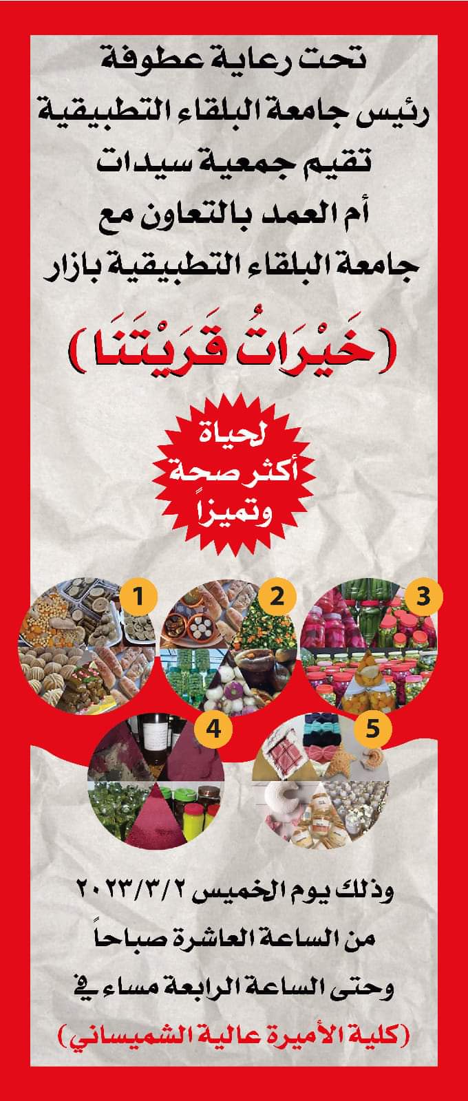 تقيم وحدة التنمية و خدمة المجتمع المحلي و بالتعاون مع جمعية ام العمد الخيرية بازار خيري وذلك يوم الخميس 2023/3/2 الساعه العاشرة في كلية الاميره عالية الجامعية.