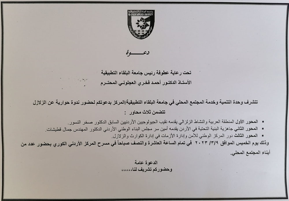 تحت رعاية الاستاذ الدكتور أحمد فخري العجلوني رئيس جامعة البلقاء التطبيقية