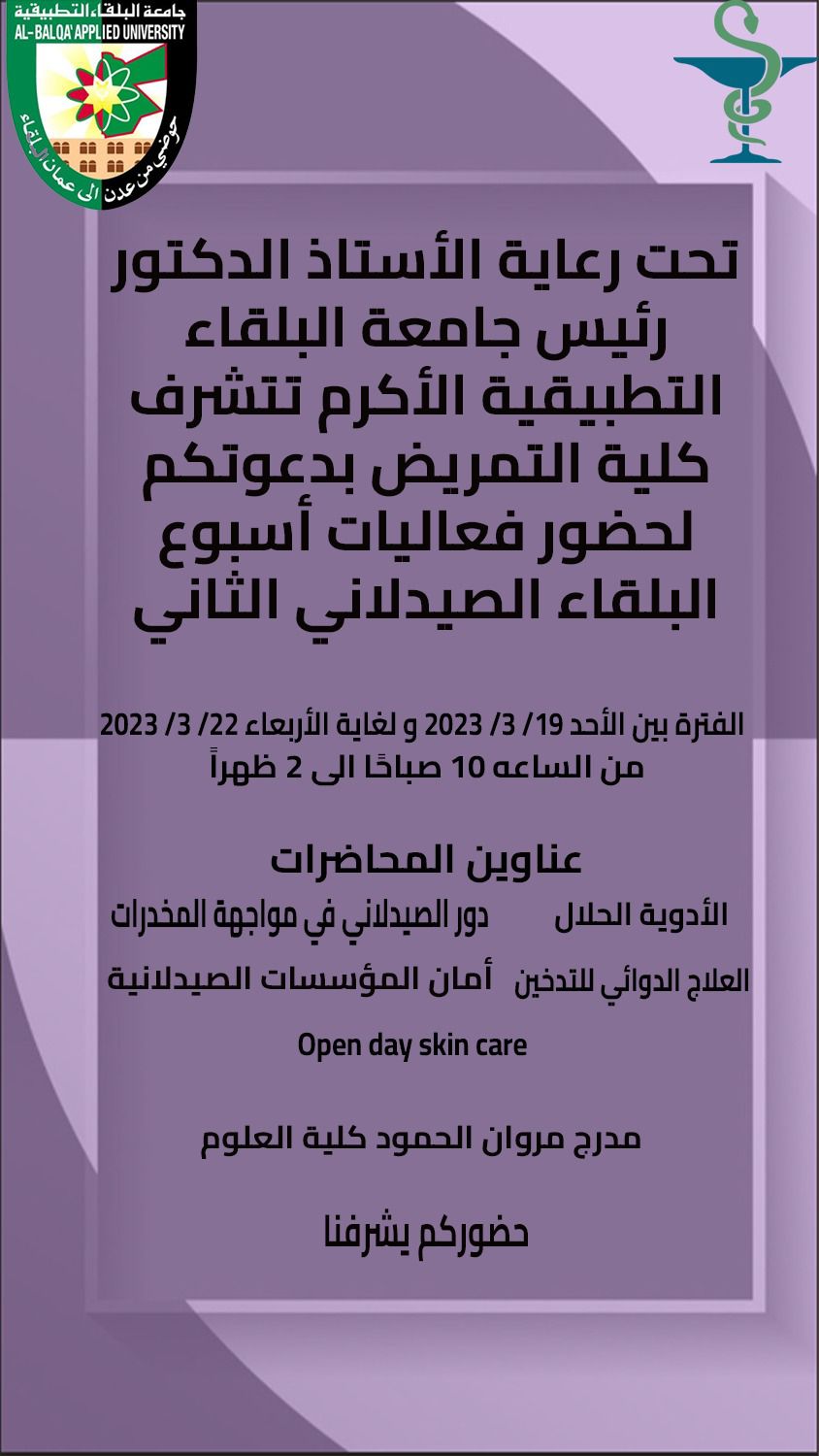 تحت رعاية الأستاذ الدكتور رئيس جامعة البلقاء التطبيقية الأكرم تقيم كلية التمريض فعاليات أسبوع البلقاء الصيدلاني الثاني و ذلك في الفترة بين الأحد 19/ 3/ 2023 و لغاية الأربعاء 22/ 3/ 2023 في مدرج مروان الحمود كلية العلوم