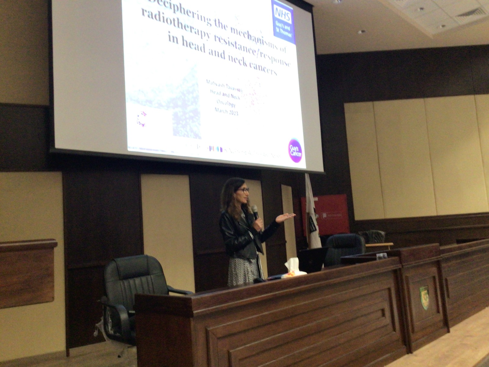 وتمحورت المحاضرة حول تأثير العوامل البيئية والجينية المحيطة بأورام الرأس والرقبة، على مدى استجابة المرضى للأدوية الكيماوية والبيولوجية التي تؤخذ مع العلاج الإشعاعي حيث أوضحت الدراسات أن بعض هذه الأورام لا تستجيب للعلاج البيولوجي والإشعاعي وأنها يمكن أن تستجيب بشكل أفضل لأدوية جديدة يتم دراستها.