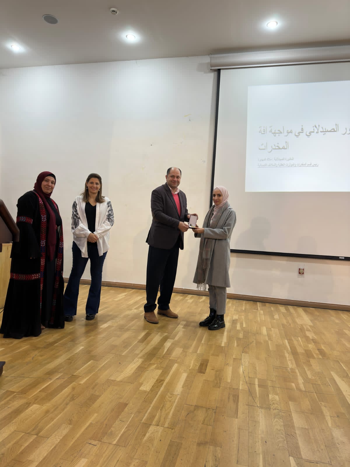 بحضور عميد كلية التمريض و أعضاء الهيئة التدريسية و الإدارية و طلاب الكلية اختتم في مدرج مروان الحمود فعاليات أسبوع البلقاء الصيدلاني الثاني حيث ناقش اليوم الأخير دور الصيدلاني في مواجهة آفة المخدرات حيث تحدثت الدكتورة ملاك المهايرة رئيس قسم المخدرات و المؤثرات العقلية و السلائف الكيميائية عضو اللجنة الوطنية لمكافحة المخدرات عضو اللجنة الوطنية للصحة النفسية عضو اللجنة الفنية لنظام فحص الدواء حيث شرحت تصنيف المواد المخدرة و الأدوية التي يساء استخدامها كمستحضرات مخدرة و الأدوية المقيدة و المرصدة و الفرق بينها و قانون المخدرات و المؤثرات العقلية و ترصيد الأدوية حسب سجلات ترصيد الأدوية المعتمدة من مؤسسة الغذاء والدواء ووضحت أسس صرف الوصفات الطبية و العلامات الأمنية على وصفات صرف الأدوية المخدرة و المؤثرات العقلية وناقشت تعليمات صرف الأدوية المهدئة و النفسية في الصيدليات و تعليمات التعامل مع المخدرات و المؤثرات العقلية في المستشفيات للأطباء والصيادلة والممرضين.