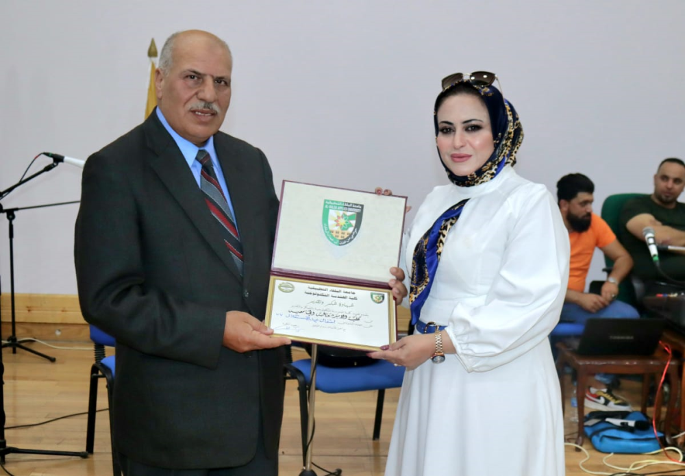 وفي نهاية الإحتفال سلم عميد كلية الهندسة التكنولوجية الأستاذ الدكتور أحمد عواد مشكوراَ شهادة تقدير باسم كلية الأميرة عالية استلمتها الدكتورة مي الرقاد والسيد مهند العساف.