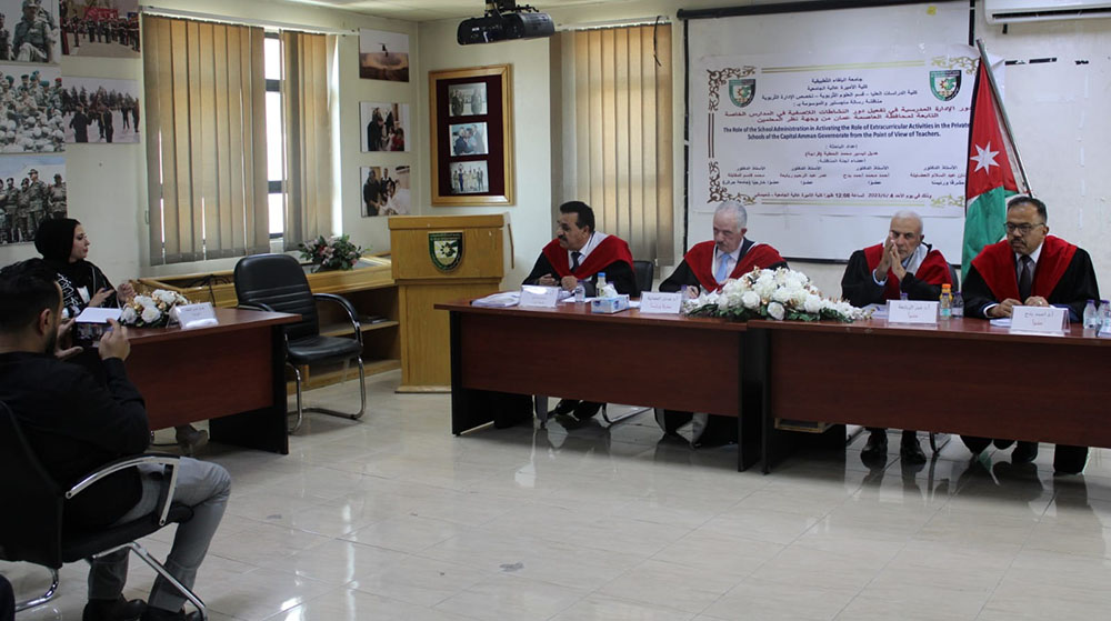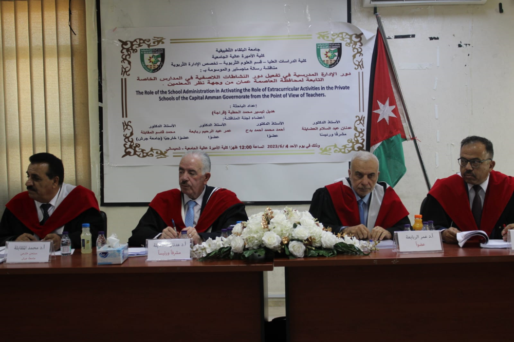 تم في صباح يوم الاحد الموافق 4/6/2023 ، مناقشة رسالة ماجستير للطالبة هديل تيسير الحطبة (قراجة) تخصص الادارة التربوية قسم العلوم التربوية والموسومة بـ :