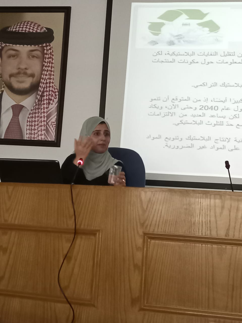 المقدم الرئيس للمحاضرة الدكتورة نور الخرابشة من كلية الزراعة التكنولوجية بينت مخاطر التلوث البلاستيكي على الإنسان والأنظمة البيئية من حوله وأثرها على النبات والحيوان والماء والهواء والتربة وأنواع التلوث البلاستيكي ومصادره وأسباب انتشاره وضرورة تقنين استخدام المواد البلاستيكية في الصناعات الغذائية واستخدام بدائل آمنة وصديقة للبيئة، وفصلت في حديثها الاضرار الناتجة عن التخلص العشوائي لهذه الماده لصعوبة تحللها وبقائها لسنين طويلة في التربة، وشرحت الطرق السليمة لمعالجة هذه المشكلة ومن بين تلك الحلول ايجاد بدائل صديقة للبيئة؛ كإعادة استخدام تلك المخلفات على وضعها الطبيعي لغايات مفيدة دون معالجة كالاغلفة والعبوات والصناديق وغيرها، وتفعيل آليات إعادة الشراء وكذلك تفعيل ما يسمى ببرامج الودائع المستردة للأوعية البلاستيكية أو الأجهزة والأدوات التي يدخل البلاستيك في صناعتها، أو حتى استخدام حلول بيئية زراعية من خلال زراعة بعض أنواع الفطر في مكبات النفايات والتي اكتشف بأنها قادرة على افراز هرمون لتحليل البلاستيك. تأتي أهمية هذه الحلول البيئية في ضوء الكلفة المرتفعة لعملية التدوير وما ينتج عنها من مواد ضارة بالبيئة نتيجة لاستخدام الوقود الأحفوري مصدرا للطاقة اللازمة للصهر وكذلك صعوبة التعامل معها نظرا لانخفاض درجة انصهارها عداك عن الاسهام القليل لهذه العملية في التخلص من التلوث البلاستيكي.