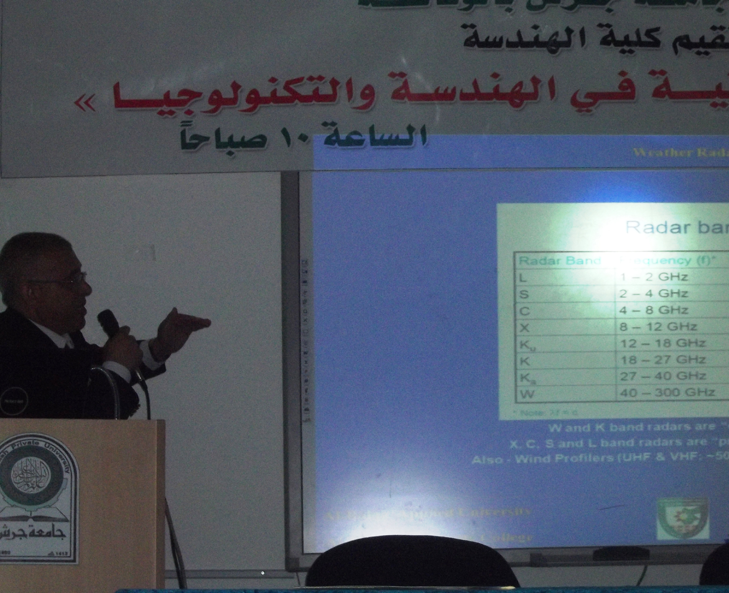 انطلاقا من الدور المجتمعي الذي تضطلع به جامعة البلقاء التطبيقية وعلى امتداد رقعة الوطن حيثما وجدت كلياتها مناراة تشع علما ومعرفة ، قدم عميد كلية الحصن الأستاذ الدكتور يحيا خريسات ورقة عمل ضمن فعاليات ورشة العمل التي أقامتها جامعة جرش الأهلية في رحاب كلية الهندسة وبحضور عدد كبير من الأكاديميين والمتخصصين في مجال الهندسة الكهربائية، حيث كان عنوان ورقة العمل (استعمال اجهزة الرادار في الارصاد الجوية) ،حيث اشتملت على معلومات علمية متخصصة ونماذج على استعمال أجهزة الرادار في الارصاد الجوية وبحث علمي تحليلي متعمق تم اعتماده بناءا على دراسة علمية .