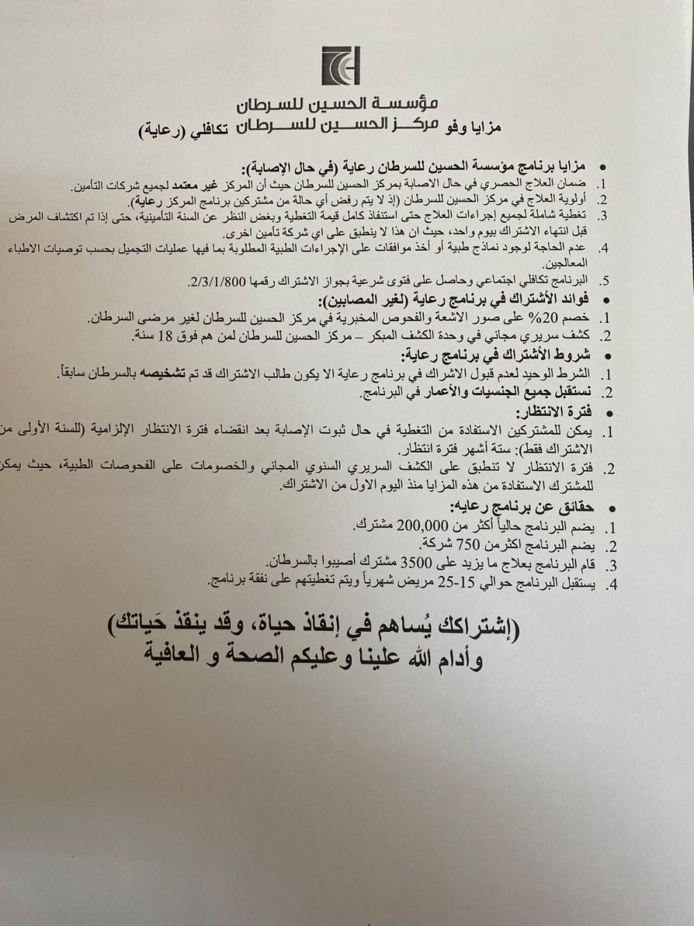علما بأنه تتوفر على موقع الجامعه /وحدة التأمين الصحي نموذج طلب الاشتراك في برنامج مركز الحسين "رعايه تكافليه" للتأمين ضد مرض السرطان لمن يرغب بالاشتراك تعبئه الطلب وارفاقه في ديوان الكليه/الوحده في مركز الجامعه ومراجعه مندوب التأمين الصحي /الكليات الخارجيه.