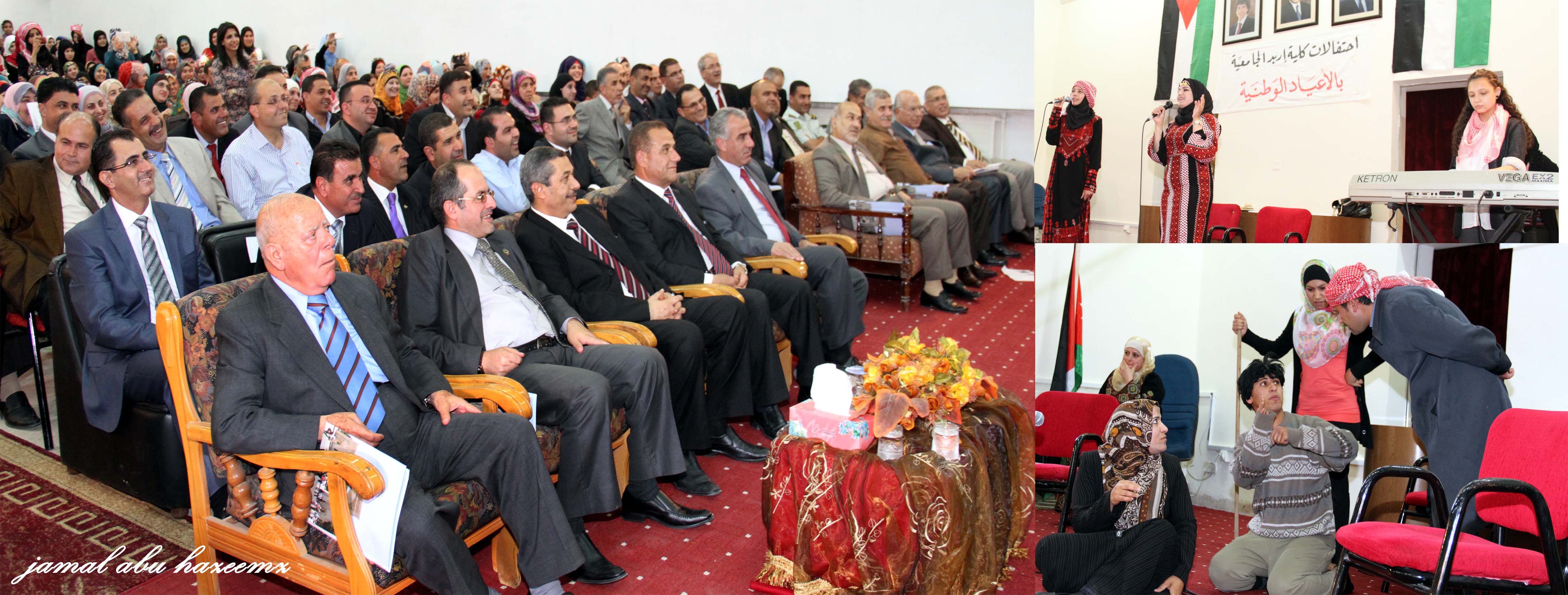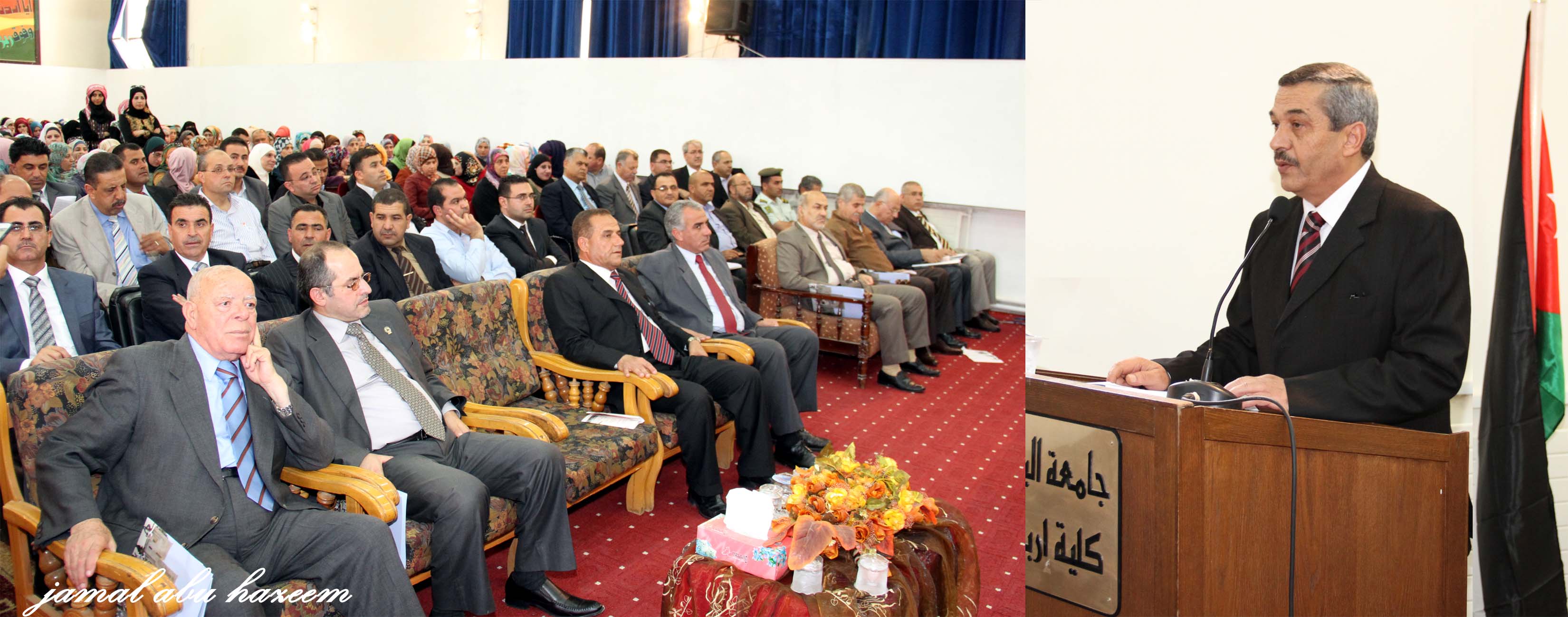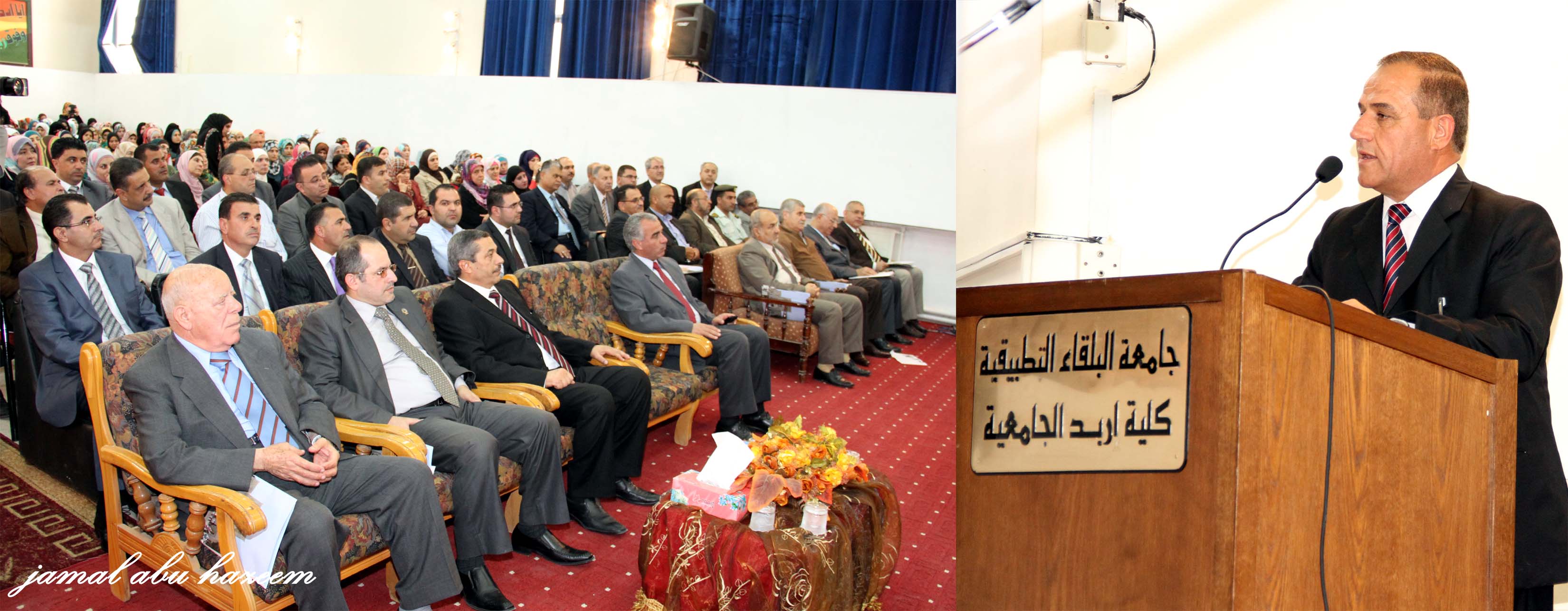 الدكتور محمد بني دومي عميد الكلية قال في كلمته بأن المناسبات الوطنية تذكرنا بما بذله البناة الأوائل والمؤسسون لوطننا وتضحيات الأباء والأجداد في العديد من المفاصل التاريخية في حياة الأمة والوطن , وأنها تعني لنا الحرص على وطننا والمحافظة على منجزاته, وبأن كلية اربد الجامعية وتحقيقاً لرسالتها قامت بالانفتاح على مجتمعها المحلي, وبناء جسور تعاون مع المؤسسسات الحكومية والخاصة في المحافظة .