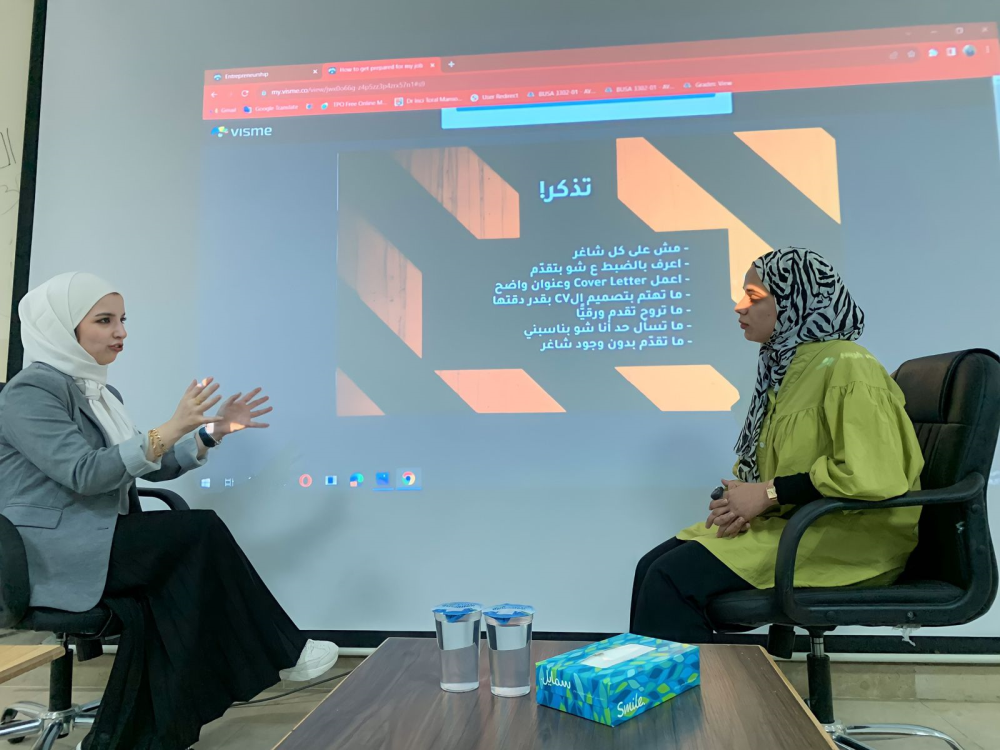 ومن جانبها، قدمت المهندسة سندس طلافحة جلسة حول التحضير الشامل لسوق العمل، حيث تناولت أساليب التأهيل والتدريب اللازمة لتجاوز تحديات المقابلات الشخصية بنجاح. تمحورت هذه الجلسة حول تقديم نصائح وإرشادات قيمة للطلبة، تعزز من فرصهم في الاندماج في سوق العمل بثقة وإلمام.