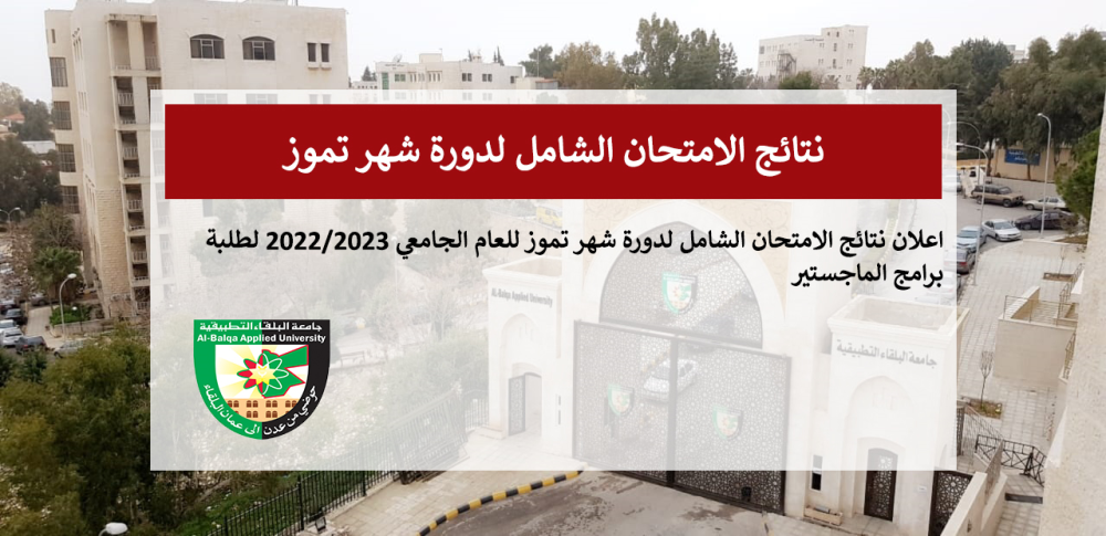 تعلن الأستاذ الدكتورة عميد كلية الدراسات العليا عن نتائج الامتحان الشامل لدورة شهر تموز للعام الجامعي 2022/2023 لطلبة برامج الماجستير وعلى النحو المرفق
