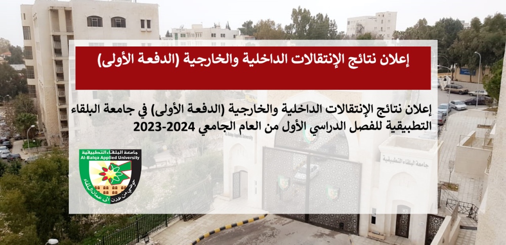 يعلن المسجل العام في جامعة البلقاء التطبيقية عن أسماء الطلبة الذين تمت الموافقة على انتقالهم من الجامعات الرسمية الأخرى الى جامعة البلقاء التطبيقية, ومن كلية الى اخرى أو من تخصص الى آخر وأسماء الطلبة المتقدمين بطلبات الإنتقال من أكاديمية الأمير الحسين بن عبدالله الثاني للحماية المدنية (الدفعــة الأولــى) على بداية للفصل الدراسي الأول من العام الجامعي 2023/2024.
