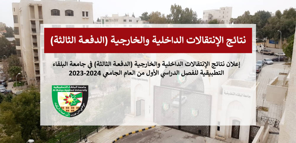 يعلن المسجل العام في جامعة البلقاء التطبيقية عن أسماء الطلبة الذين تمت الموافقة على انتقالهم من الجامعات الرسمية الأخرى الى جامعة البلقاء التطبيقية, ومن كلية الى اخرى أو من تخصص الى آخر وأسماء الطلبة المتقدمين بطلبات الإنتقال من أكاديمية الأمير الحسين بن عبدالله الثاني للحماية المدنية (الدفعــة الثالثة) على بداية للفصل الدراسي الأول من العام الجامعي 2023/2024.