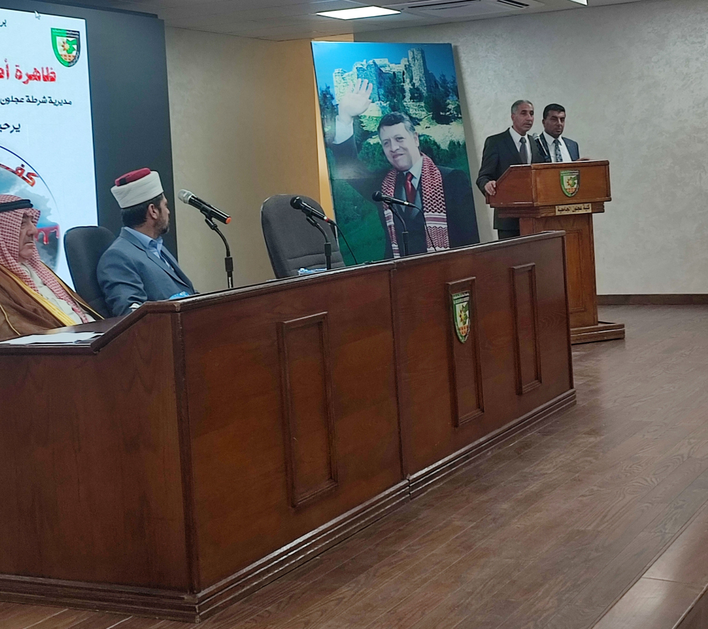 برعاية محافظ عجلون الدكتور قبلان الشريف نظمت مديرية شرطة عجلون /الشرطة المجتمعية وبالتعاون مع كلية عجلون الجامعية ندوة حوارية بعنوان "ظاهرة إطلاق العيارات النارية " بحضورعطوفة مديرأمن أقليم الشمال العميد نورز هاكوز ومدير شرطة عجلون العميد وصفي العزام وعدد من مدراء الدوائر والمؤسسات الحكومية و أعضاء الهيئة الإدارية في الكلية في قاعة الشهيد محمد العزام .
