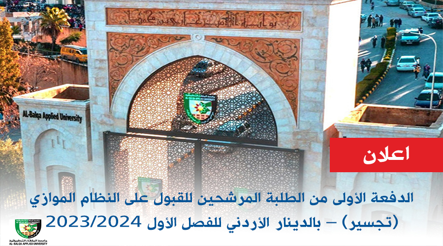 يعلن المسجل العام في جامعة البلقاء التطبيقية للطلبة المرشحين للقبول على النظام الموازي بالدينار الأردني (التجسير) في جميع تخصصات برنامج البكالوريوس ضمن الدفعة الأولى الذين استلموا رسائل (SMS) تفيد بقبولهم من جامعة البلقاء التطبيقية و استكمال عملية الدفع الالكتروني والحصول على الرقم الجامعي وذلك على الفصل الدراسي الأول 2023-2024 و حتى نهاية دوام يوم الأحد الموافق 2023/10/1، علماً بأنه لن يتم استقبال أي طالب لم يقم باستكمال إجراءات قبوله بعد ذلك التاريخ، وإلا يعتبر مستنكفا وفاقدا لمقعده.