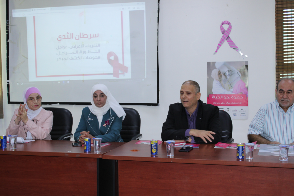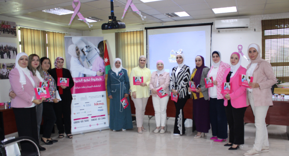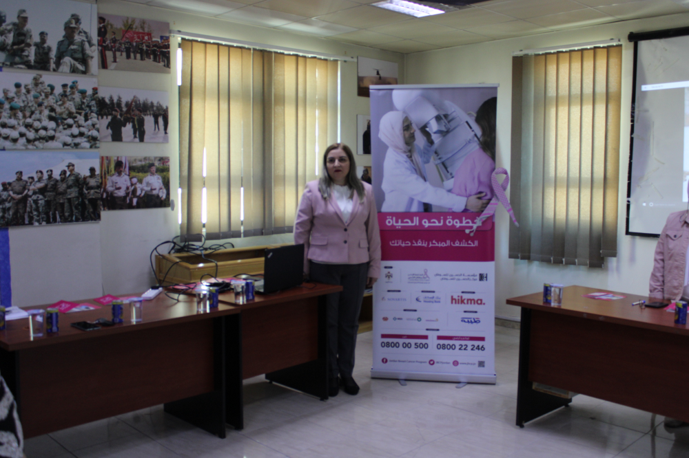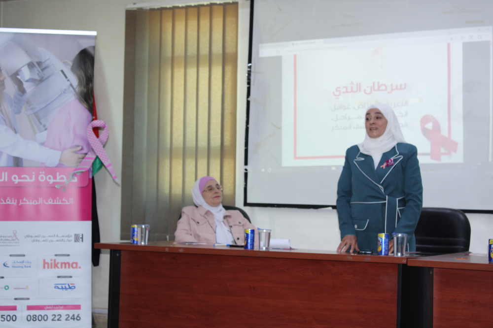 وقامت المثقفة صحيًا من مؤسسة الحسين للسرطان السيدة أزهار النصر بإطلاع الحضور على البرنامج الأردني لسرطان الثدي كونه برنامجًا وطنيًا تم تأسيسه عام 2007 بقيادة ودعم مؤسسة ومركز الحسين للسرطان ووزارة الصحة ،ويهدف إلى خفض معدلات الوفيات الناجمة عن سرطان الثدي من خلال الفحص المبكر ويتضمن البرنامج ثلاثة محاور :