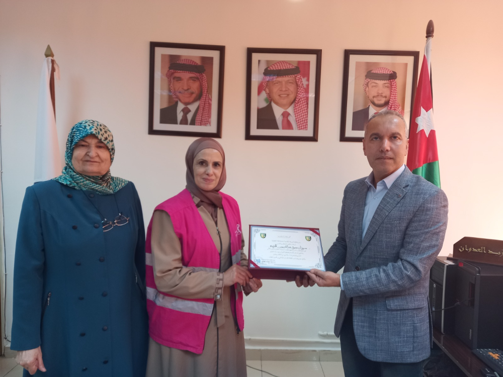 وفي ختام الورشة قام عميد الكلية الأستاذ الدكتور زيد سليمان العدوان  بتسليم شهادة  شكر وتقدير للسيدة سوزان يمين تقديرا لجهودها المبذولة في هذه الحملة الوطنية مؤكدا على أهمية إقامة مثل هذه الحملات التوعوية للمجتمع المحلي ولطلبة الكلية.