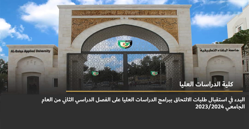 تعلن كلية الدراسات العليا في جامعة البلقاء التطبيقية عن البدء في استقبال طلبات الالتحاق ببرامج الدراسات العليا للفصل الدراسي الثاني من العام الجامعي 2023/2024 اعتباراً من يوم الاربعاء الموافق 6/12/2023 ولغاية يوم الخميس 4/1/2024