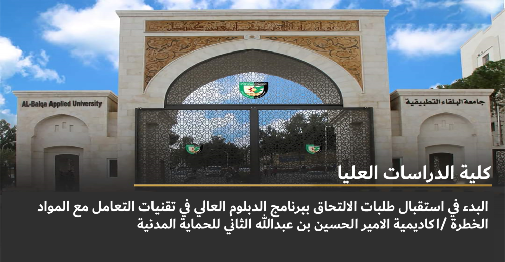 تعلن كلية الدراسات العليا في جامعة البلقاء التطبيقية عن البدء في استقبال طلبات الالتحاق ببرنامج الدبلوم العالي في تقنيات التعامل مع المواد الخطرة /اكاديمية الامير الحسين بن عبدالله الثاني للحماية المدنية على الفصل الدراسي الثاني من العام الجامعي 2023/2024 اعتباراً من يوم الخميس 7/12/2023 ولغاية يوم الخميس 4/1/2024