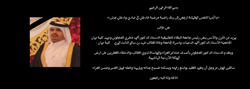 بمزيد من الحزن والأسى ينعى رئيس جامعة البلقاء التطبيقية الاستاذ الدكتور أحمد فخري العجلوني وعميد كلية عمان الجامعية الأستاذ الدكتور أحمد الدحيات واسرة الجامعة وفاة الطالب فهد بن سالم النابت المري / كلية عمان .