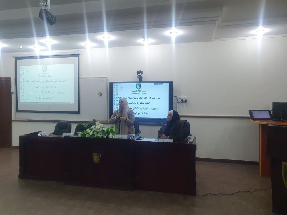 تحقيقا لرؤية جامعة البلقاء التطبيقية و كلية الزراعة التكنولوحية في اثراء خبرات الطلبة وربط دراستهم الاكاديمية بالتطبيقات العملية وخدمة المجتمع المحلي وبتوجيه من عطوفة رئيس الجامعة الاستاذ الدكتور احمد فخري العجلوني وبحضور الاستاذ الدكتورة امل العبادي نظم قسم التغذية والتصنيع الغذائي في كلية الزراعة التكنولوجية محاضرة بعنوان "التغذية والجمال" قامت بتقديمها الدكتورة ايه الكيلاني بحضور أعضاء الهيئة التدريسية والإدارية وطلبة قسم التغذية والتصنيع الغذائي حيث تحدثت الدكتورة ايه الكيلاني عن الرابط الوثيق بين التغذية السليمة والجمال وانعكاسها على الجمال الداخلي أيضا للإنسان.