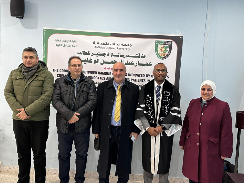 ضمن الإجراءات المعتمدة في جامعة البلقاء التطبيقية للحصول على شهادة الماجستير تم يوم الخميس الموافق 10/1/2024 مناقشة رسالة ماجستير في تخصص التحاليل الطبية والتي تقدم بها الطالب عمار عبدالرحمن ابوغليون بعنوان: