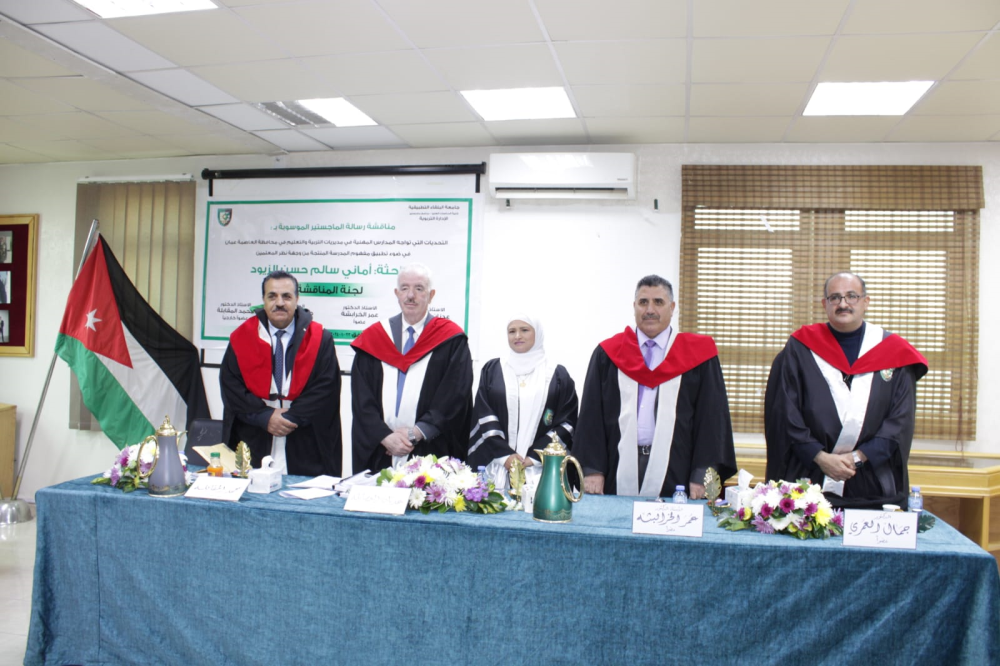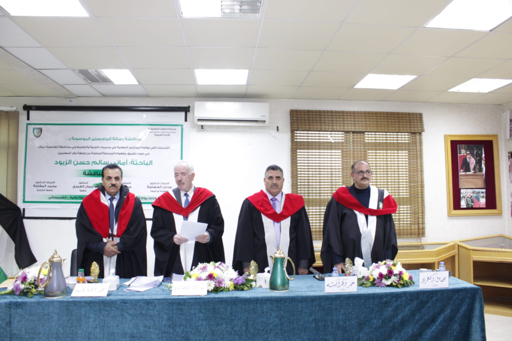 تم في صباح يوم الثلاثاء 23/1/2024  ، مناقشة رسالة ماجستير للطالبة أماني سليم الزيود تخصص الادارة التربوية قسم العلوم التربوية والموسومة بـ :