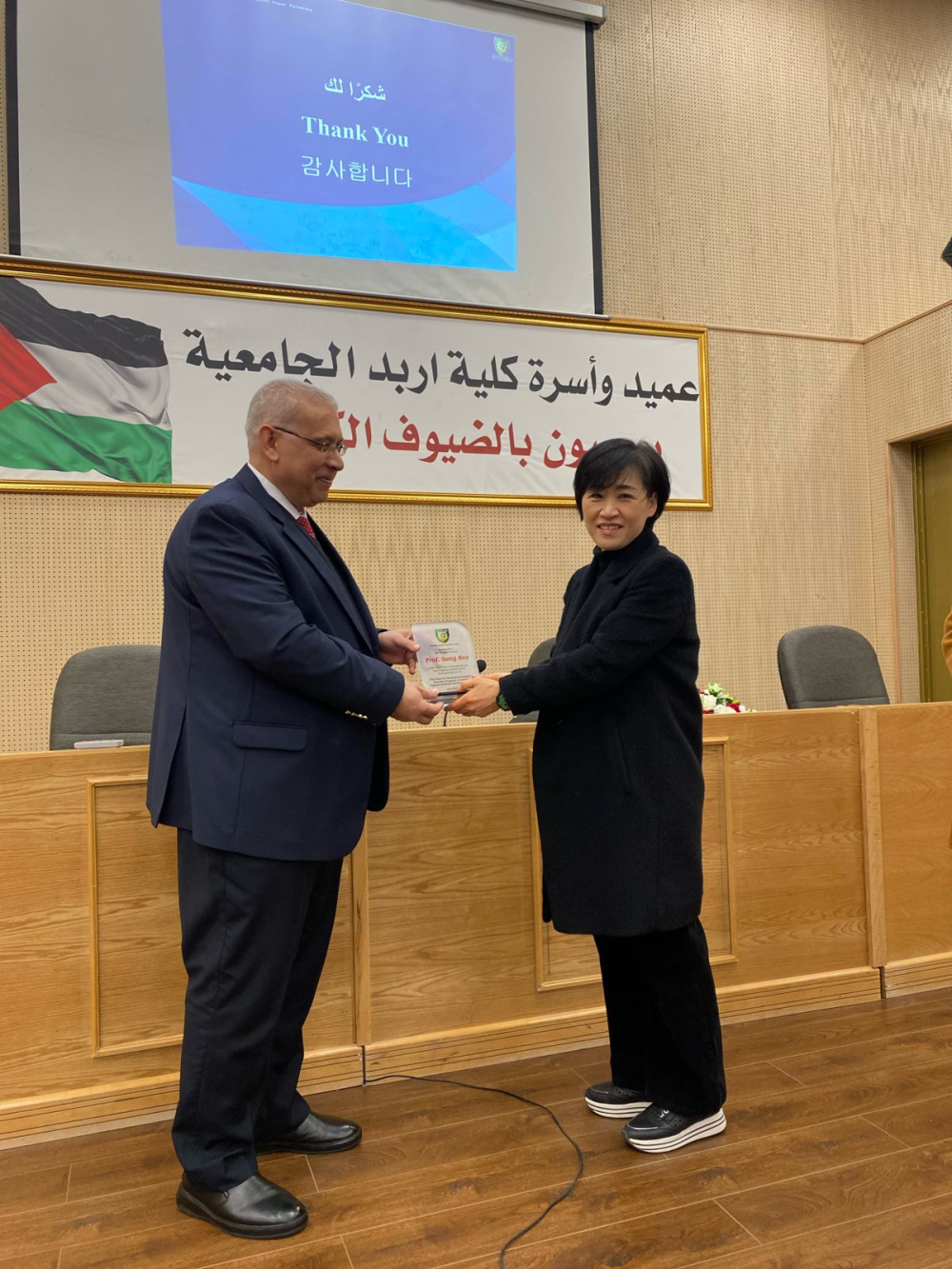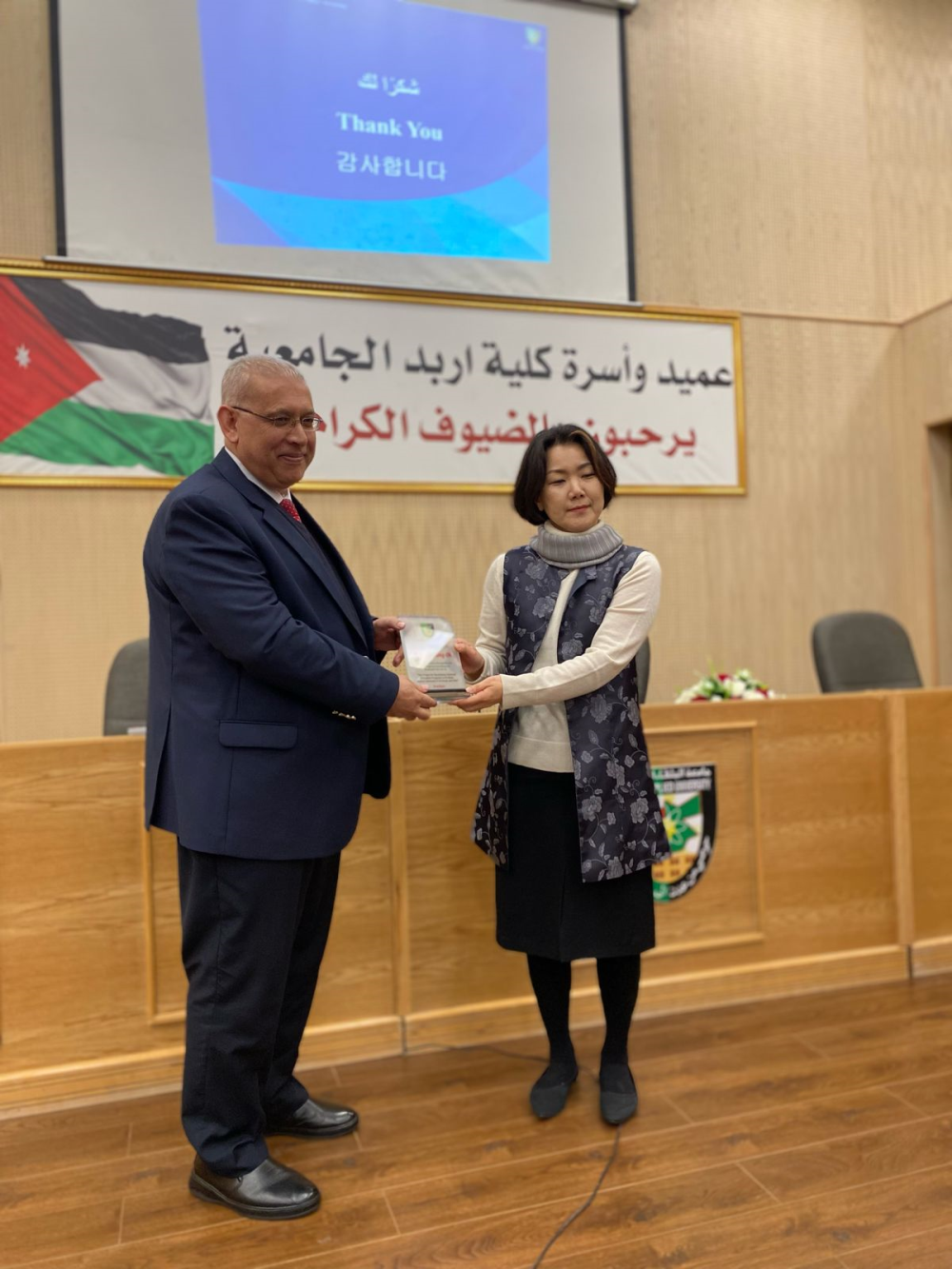 وفي ختام فعاليات التكريم قام الأستاذ الدكتور يحيا خريسات عميد الكلية  بتسليم الدروع لأعضاء الوفد الكوري التالية أسماؤهم لجهودهم المبذولة في عقد الدورات التدريبية داخل حرم الكلية: