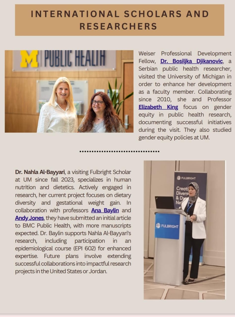 نشرت الجريدة الإخبارية الصادرة عن كلية الصحة العامة في جامعة ميشيغان، أناربر- الولايات المتحدة الأمريكية في عددها الصادر على الفصل الشتوي 2024 وتحت عنوان العلماء والباحثيين الدوليين خبراً عن الدكتورة نهلة البياري، الأستاذ المشارك في قسم التغذية والتصنيع الغذائي - كلية الحصن الجامعية والحاصلة على منحة فلبرايت كباحث زائر في جامعة ميشيغان - كلية الصحة العامة - قسم علوم التغذية منذ 20 أيلول 2023. تضمن الخبر الحديث عن النشاط البحثي للدكتورة البياري حول التنوع الغذائي وزيادة الوزن أثناء الحمل بالتعاون مع البروفسور آنا بايلن والبروفسور آندي جونز ونجم عن هذا التعاون تقديم أول ورقة بحثية للنشر في مجلة BMC Public Health ويتوقع تقديم المزيد من الأوراق العلمية الناجمة عن هذا المشروع للنشرفي المستقبل القريب. تضمن الخبر ايضا مشاركة الدكتورة البياري في المساق المتخصص بعلم الوبائيات EPI 602 لتعزيز خبراتها الإحصائية باستخدام البرنامج الإحصائي (R) ووضع الخطط المستقبلية لتوسيع التعاون والتشارك في مشاريع بحثية مؤثرة سواء في الولايات المتحدة أو الأردن.