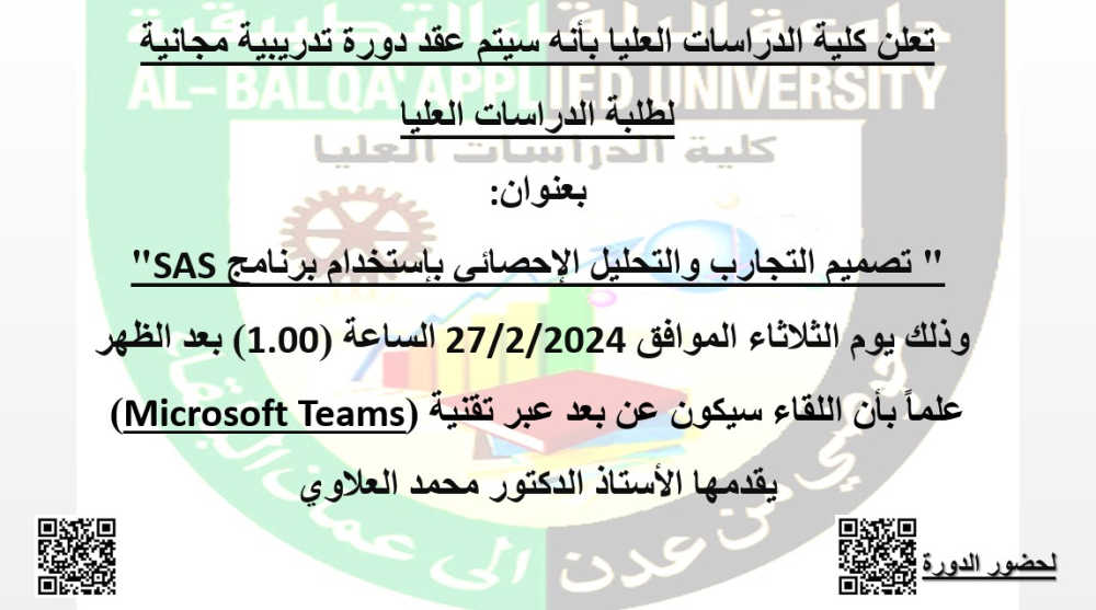 وذلك يوم الثلاثاء الموافق 27/2/2024الساعة (1.00) بعد الظهر، علماً بأن اللقاء سيكون عن بعد عبر تقنية (Microsoft Teams) يقدمها الأستاذ الدكتور محمد العلاوي