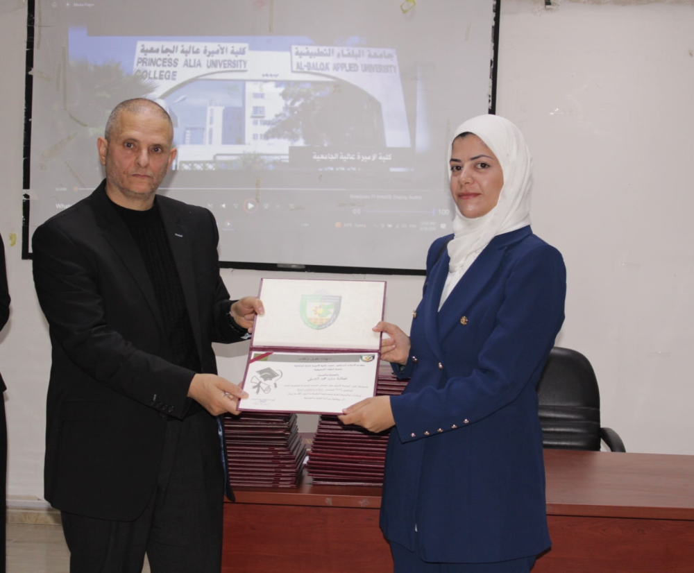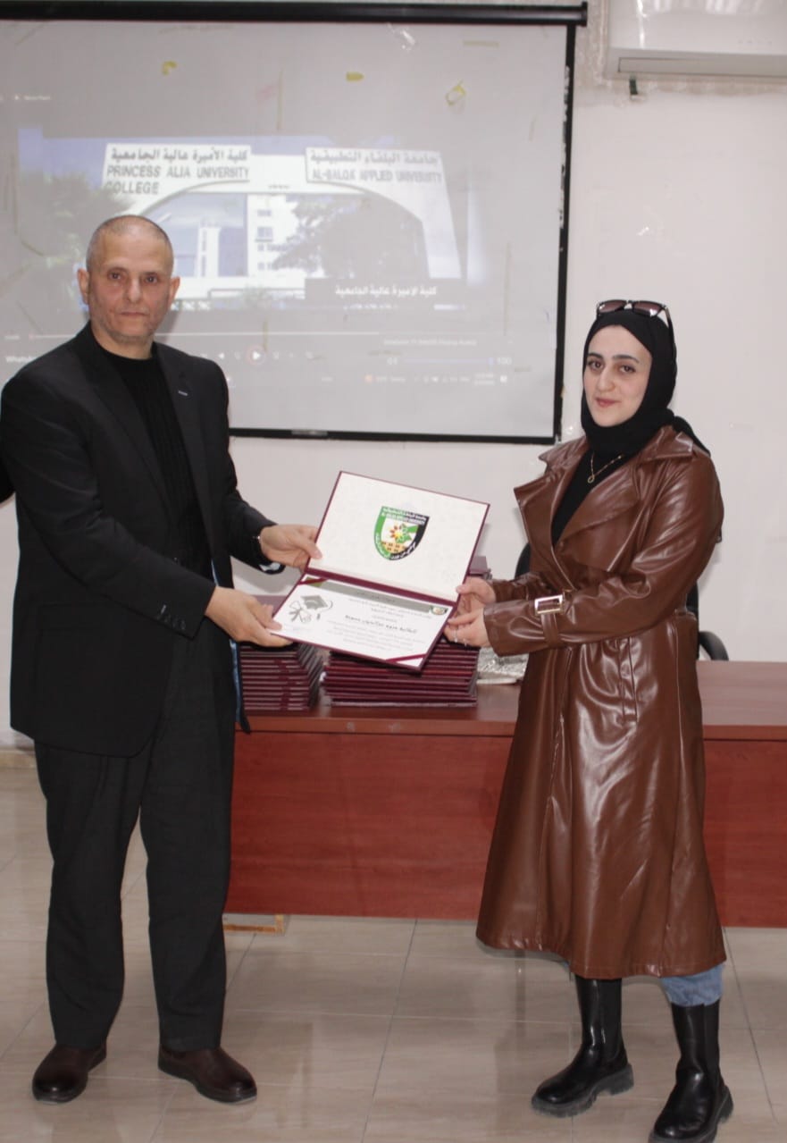 انطلاقًا من حرص جامعة البلقاء التطبيقية على مد جسور التواصل مع خريجاتها ووسط أجواء من البهجة والسرور ونيابة عن عميد كلية الأميرة عالية الجامعية الأستاذ الدكتور ناجي السعايدة رعى نائب العميد للشؤون الأكاديمية وبالتنسيق مع مساعد العميد لشؤون التطوير والتدريب والجودة نظم قسم متابعة الخريجيين حفل تكريم أوائل الطلبة بامتحان الشهادة الجامعية المتوسطة الشامل للدورة الشتوية 2024.